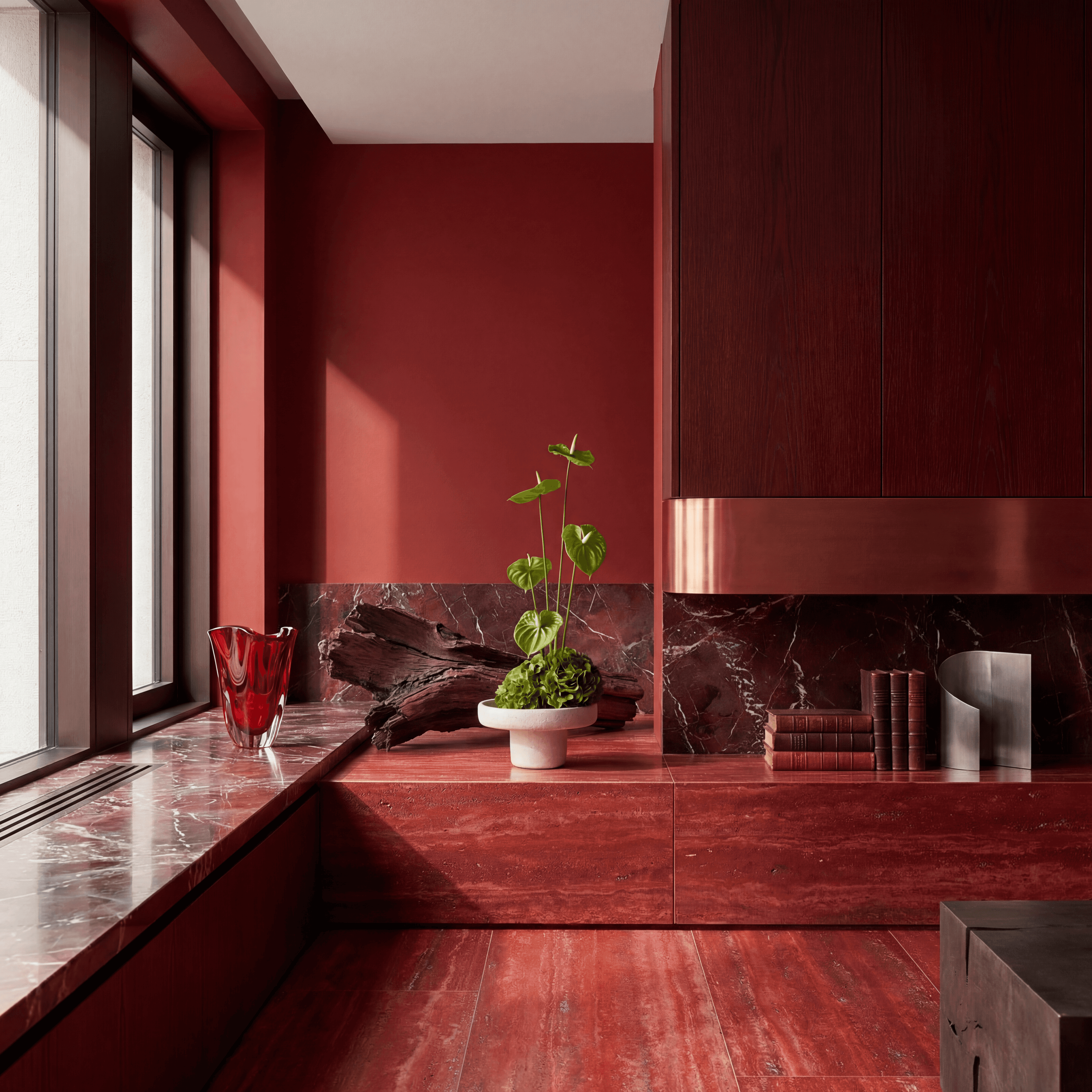 A bold sculptural silk bouquet featuring green anthuriums and beautiful real-touch green hydrangea, arranged in a flat stone bowl. The bouquet comes with our complementary floral scent.