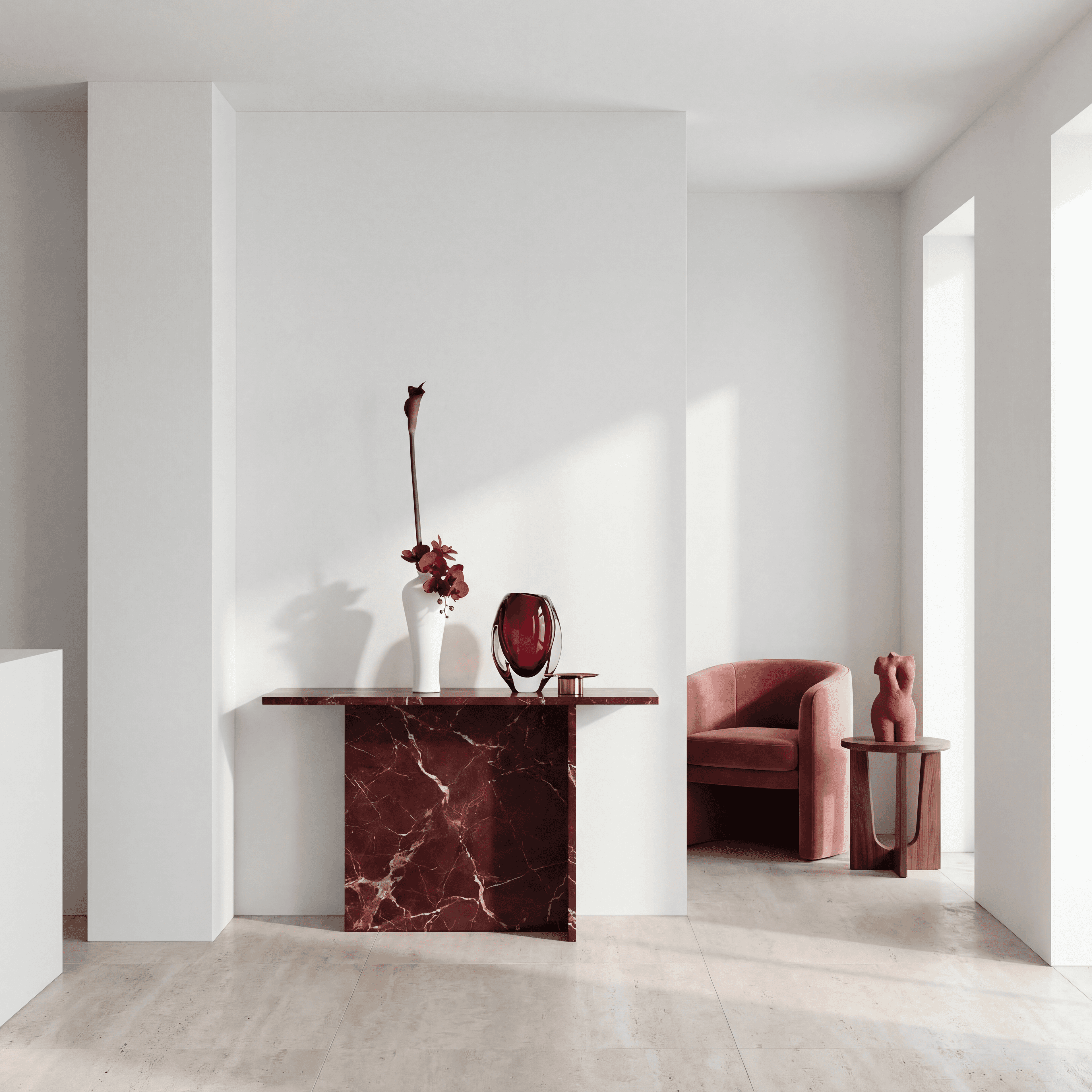 An elegant small silk bouquet featuring real-touch red phalaenopsis orchid and burgundy calla, arranged in a tall, feminine white vase. The bouquet comes with our complementary floral scent.