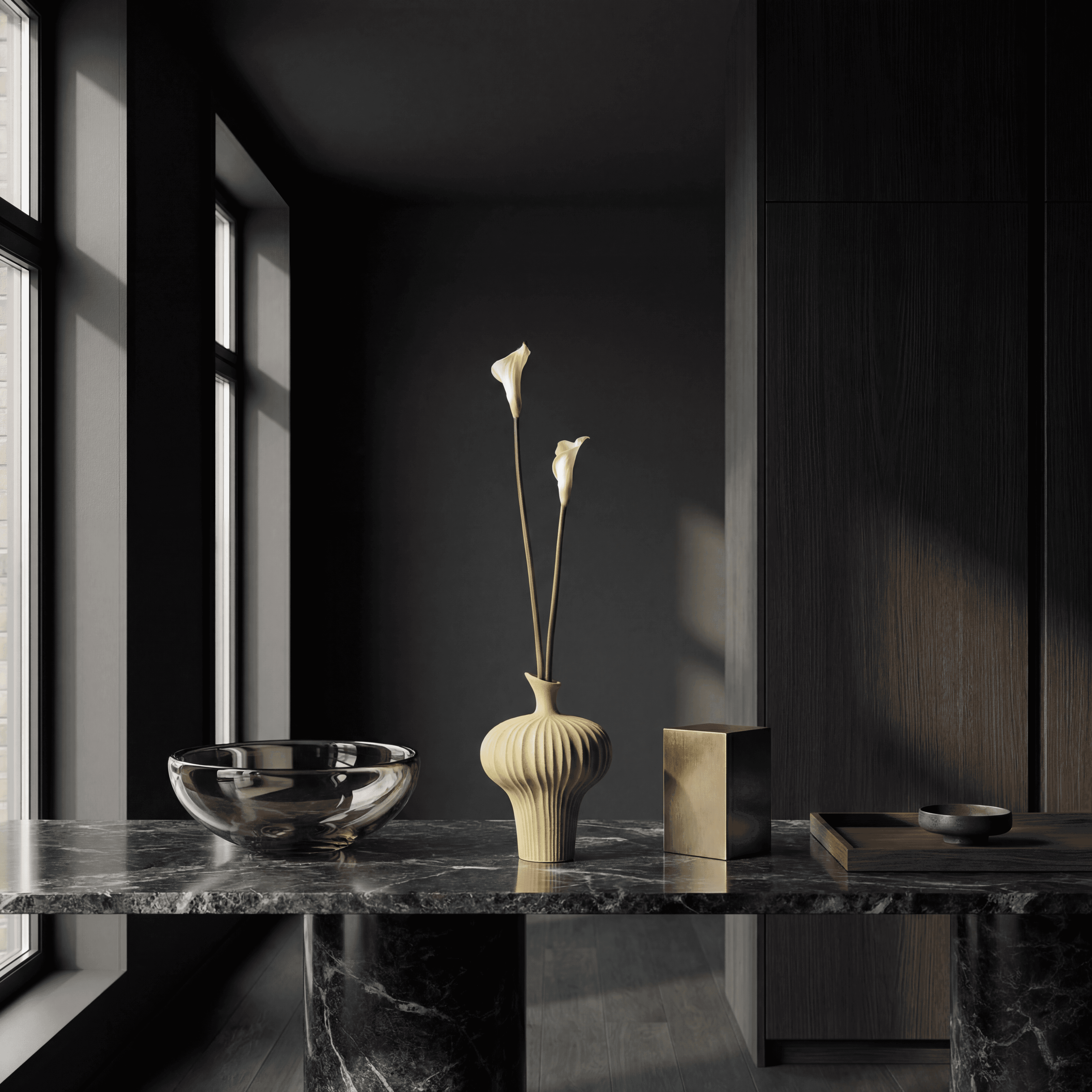 A simple yet dramatic silk bouquet featuring white callas, arranged in a green curvy vase. The bouquet comes with our complementary floral scent.
