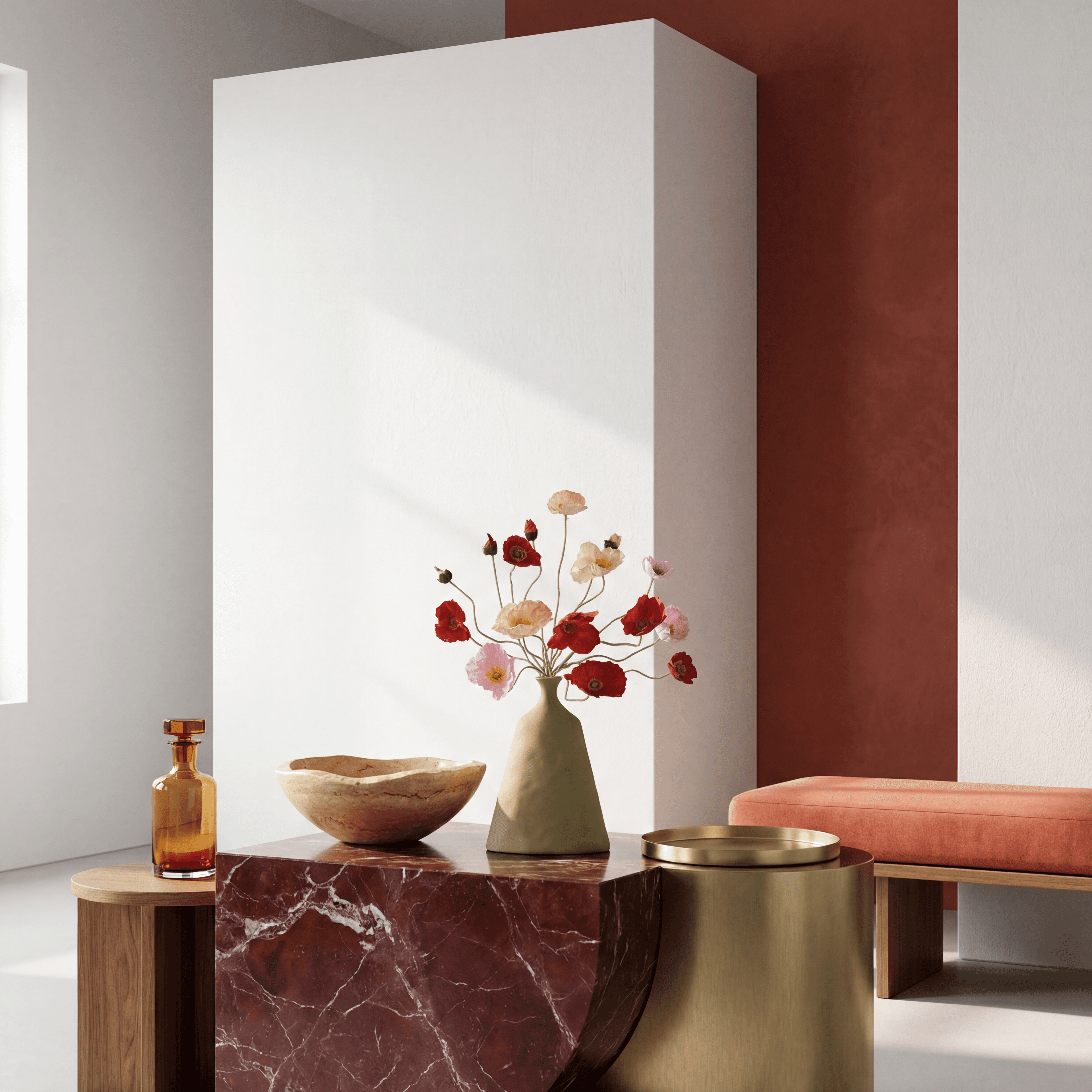 A modern silk bouquet featuring red, peach & pink poppies, arranged in a tall, flat green vase. The bouquet comes with our complementary floral scent.