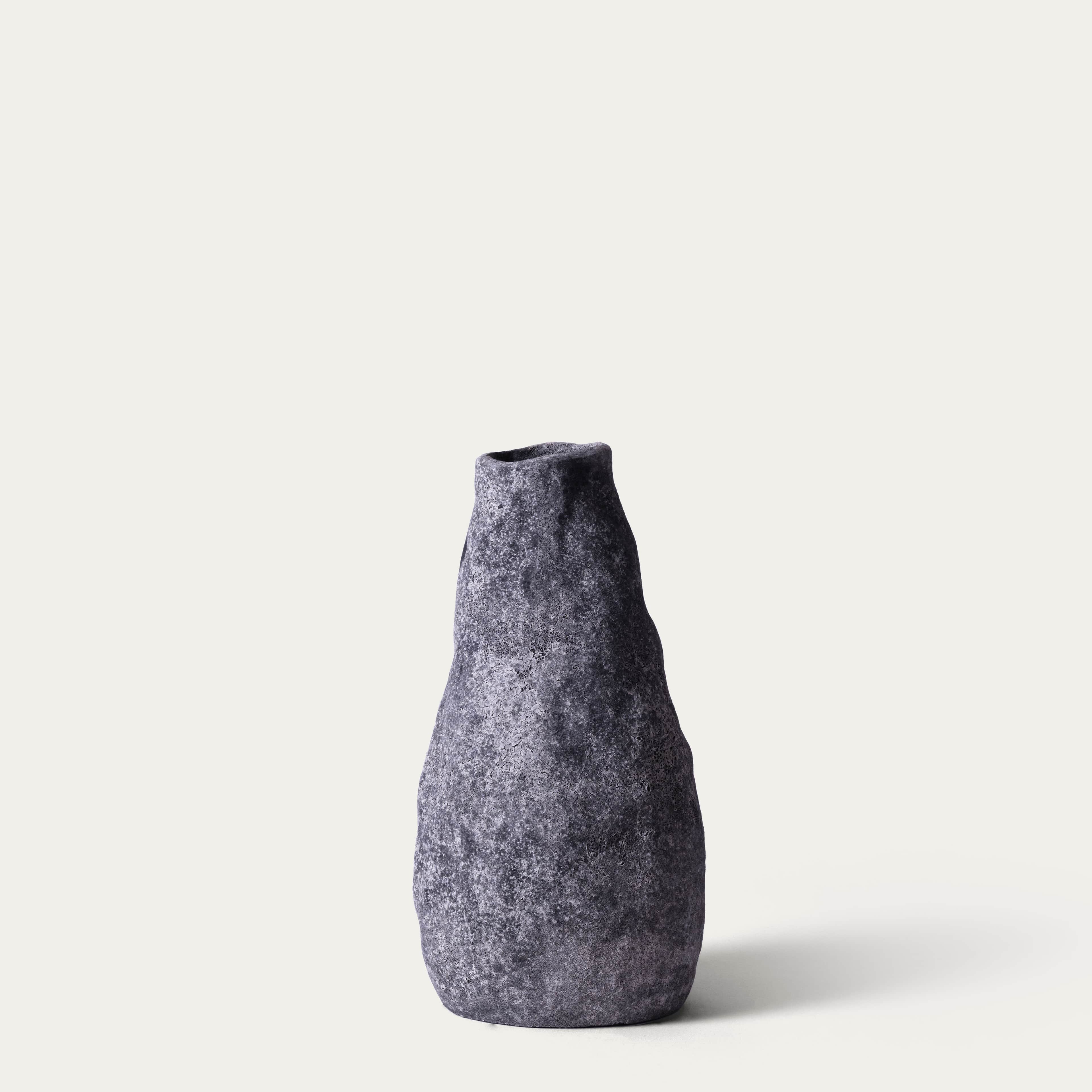 Een vaas van diep antraciet steen. Aards en stemmig; een krachtig podium voor opvallende, kleurrijke bloemen.