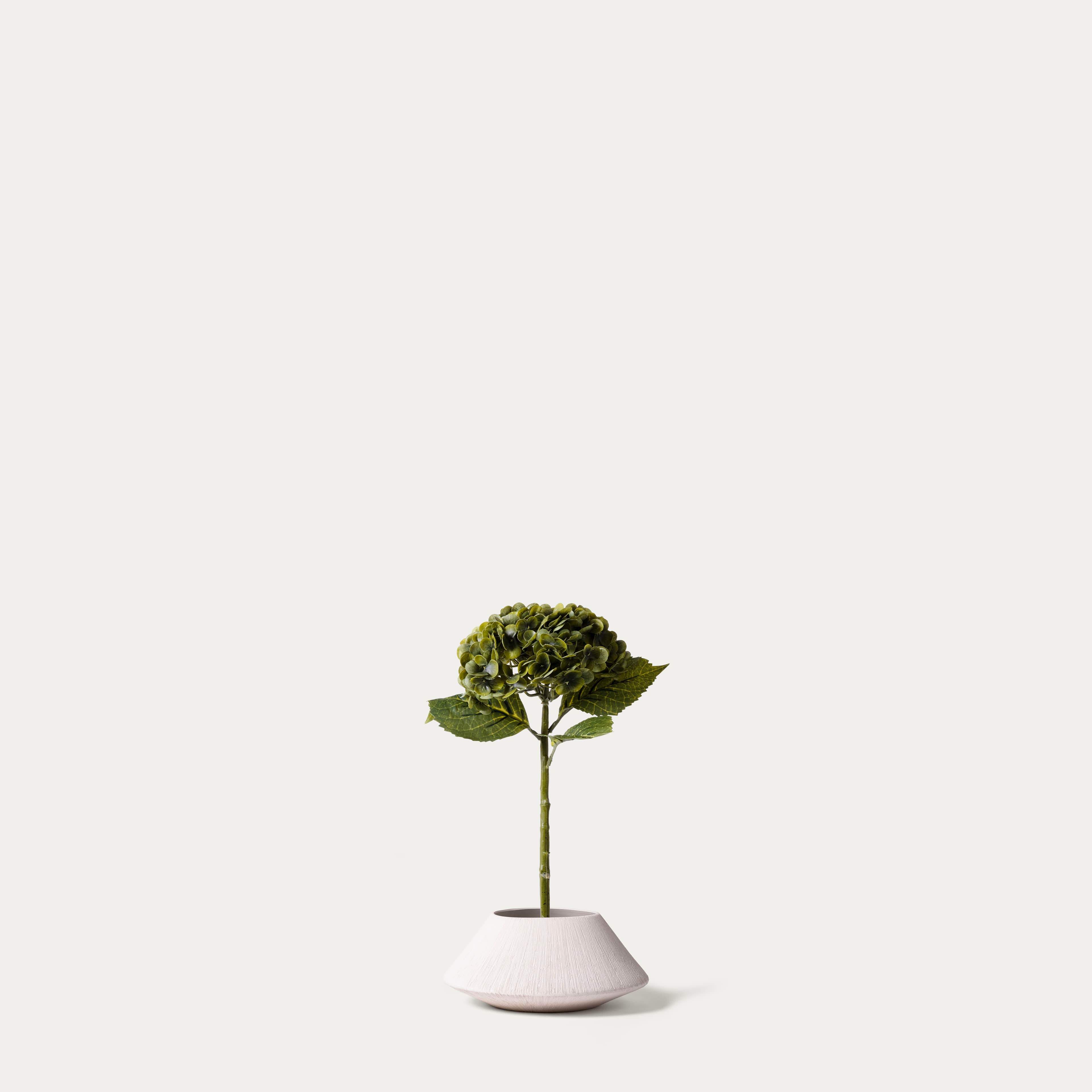 Organisch crèmekleurig vaasje met real-touch zijden hortensia’s in drie prachtige paarstinten.