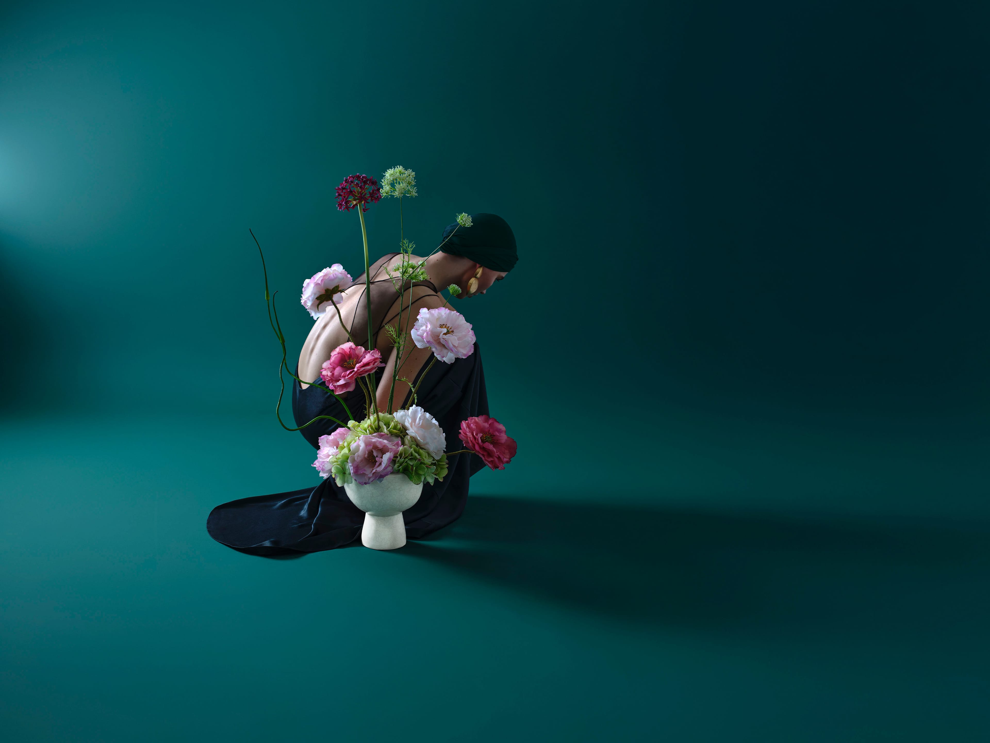 Een betoverend en uniek sculptuur met roze real-touch klaprozen, hortensia, pruimkleurige allium en Japanse knoflook.
