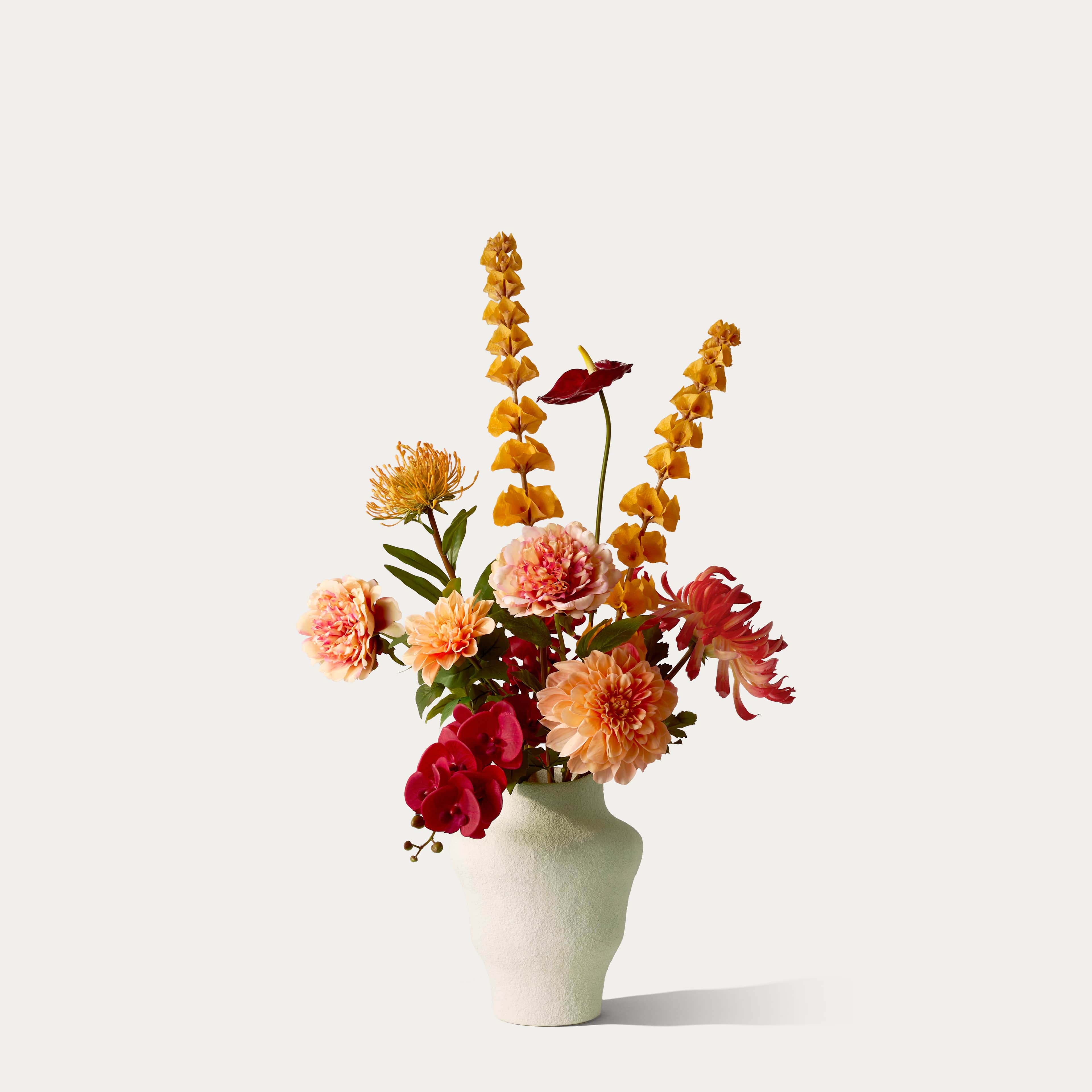 Een levendig zijden boeket in warme oranje- en dieprode tinten, met real-touch phalaenopsis orchidee, rode anthurium, klokken van Ierland, real-touch pioenen en chrysanten, geschikt in een organische off-white stenen vaas. Het boeket wordt geleverd met ons gratis bloemparfum.