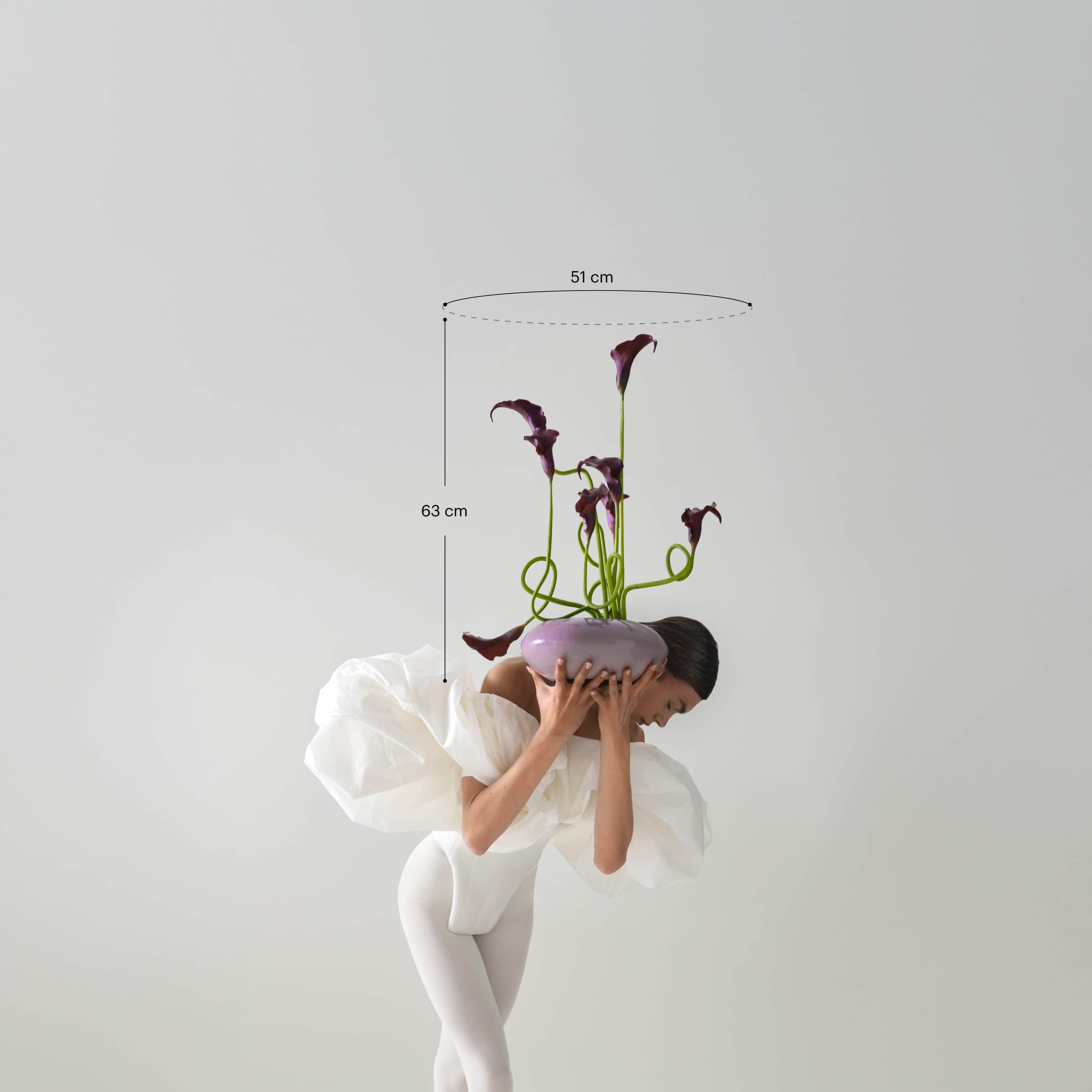 Een mono zijden bloemsculptuur in ikebana-stijl met donkerpaarse calla, geschikt in een zachtpaars schaaltje. Het boeket wordt geleverd met ons gratis bloemparfum.