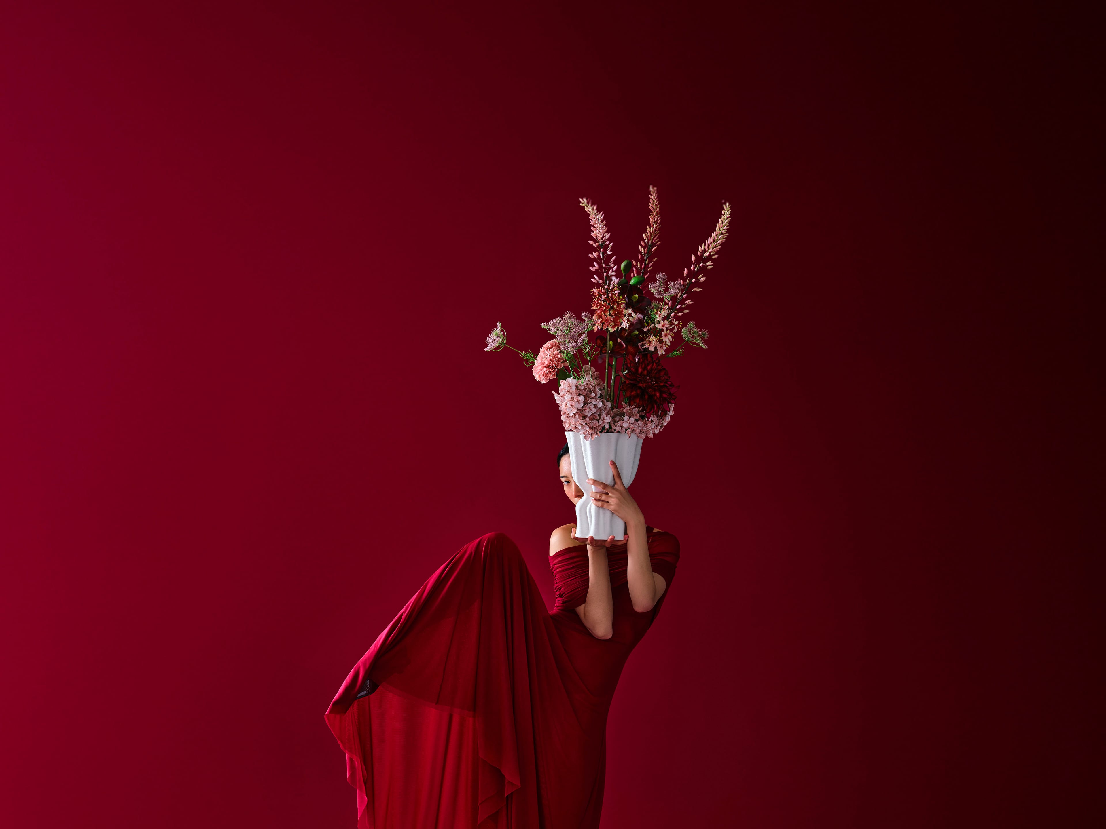 Boeket in blush- en bordeauxtonen met zijdebloemen als eremurus, primula, real-touch dahlia, cymbidium, hortensia, dille en allium, geplaatst in een organisch gevormde vaas in gebroken wit.